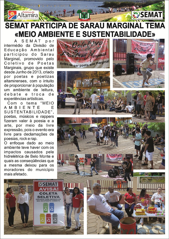 Em comemoração a Semana do Meio Ambiente a Semat realizou dia 07/06/2017 no estacionamento do Camelodromo Municipal a primeira Feira Municipal de Materiais reutilizáveis e artesanato de Altamira, a mesma tem como objetivo divulgar o artesanato do município e o trabalho com materiais reutilizáveis como pneus, palites, garrafa pet, etc. O espaço EcoCelpa estava aberto para o recebimento de matérias recicláveis, participaram também do evento o corpo de bombeiros de Altamira e o DNIT. A Coordenação de Turismo da Semat esteve presente com uma exposição de fotos de pontos turísticos de Altamira assim como fotos com registros antigos da cidade. Esse tipo de evento contribui sobremaneira para divulgar a potencialidade turística do município além de trazer um reflexão sobre sustentabilidade quando tem como proposta a divulgação dos possíveis reuso de vários materiais geradores de resíduos que causam danos ao meio ambiente.