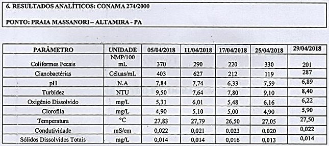 O monitoramento e análises são referentes a Abril de 2018, realizados pela Associação Instituto Internacional de Ecologia e Gerenciamento Ambiental, que realizou coleta de amostras nos dias 03/04; 11/04; 17/04; 25/04 e dia 29/04. As análises são em conformidade com a resolução CONAMA274/2000, abaixo serão relacionadas os resultados das análises: