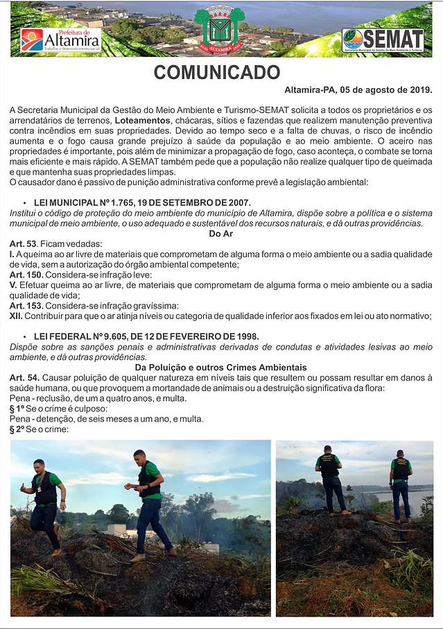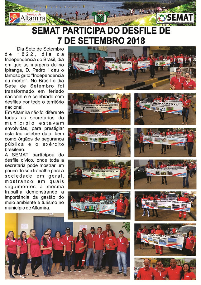Em Altamira a Secretaria da Gestão do Meio Ambiente e Turismo - SEMAT realizou a abertura da semana alusiva ao Meio Ambiente, com uma cerimonia de abertura e palestras vocacionadas aos serviços ambientais que esta secretaria oferece a população, tendo em vista a grande extensão territorial que compõe nosso município, a SEMAT tem sido incansável na busca de uma gestão ambiental atuante e efetiva.